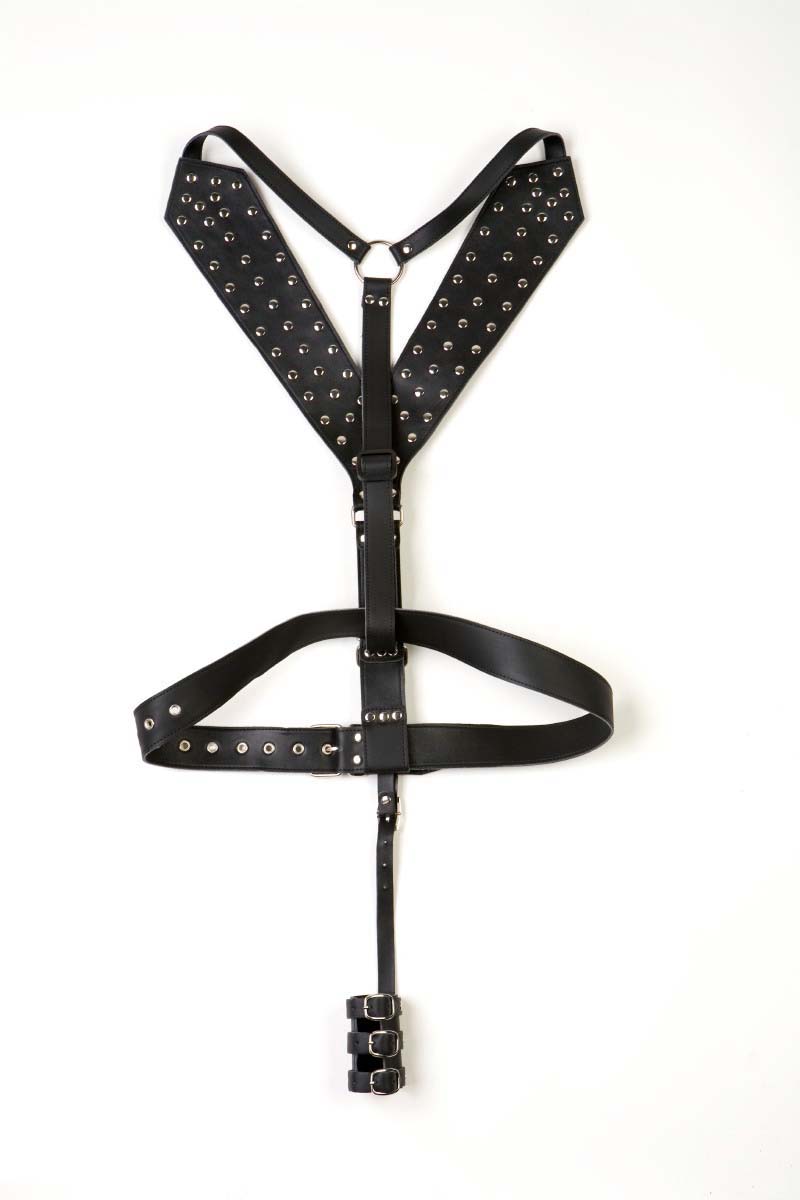 Men''s leather harness with polished chrome rivet construction and decoration. Features an adjustable penis collar that is attached by straps in the front and back. There are adjustments at the waist back and penis harness straps to accommodate a variety of size and body types. The harness is made of 100% leather.