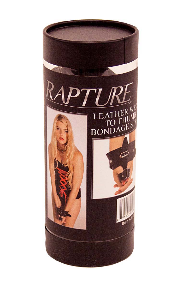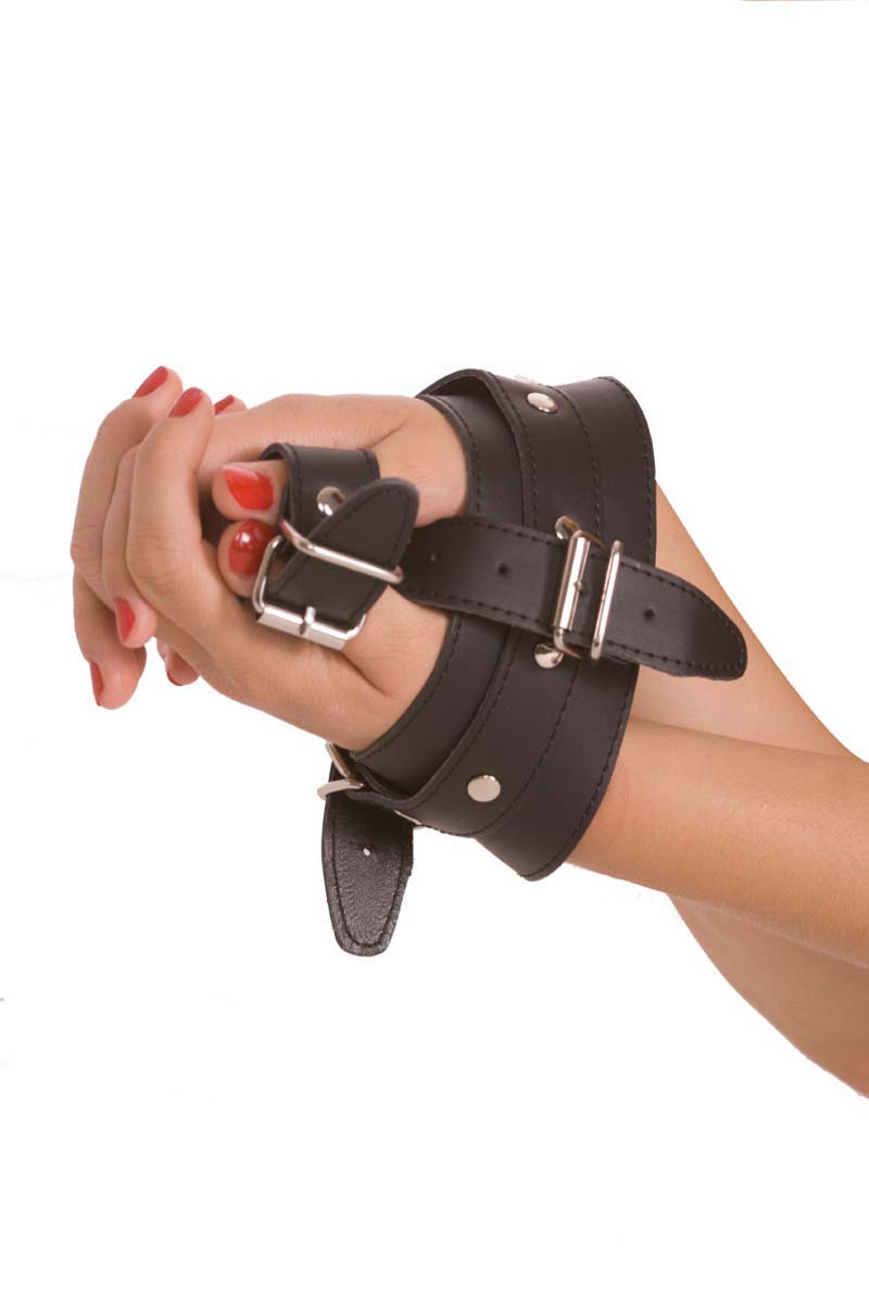 Bind up the wrists and and thumb in this unique bondage configuration. The large strap fits around both wrists and cinches them together. A second strap lead to a thumb cuff that encircles both thumbs cinching them together. The wrist and thumbs cannot be separated and are held fast producing an erotic effect. For the submissive this tie can produce a frustrating dilemma as they try to maneuver their hands.