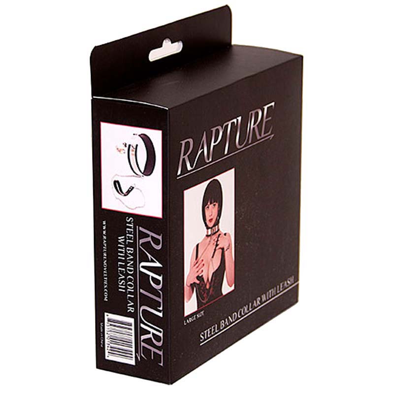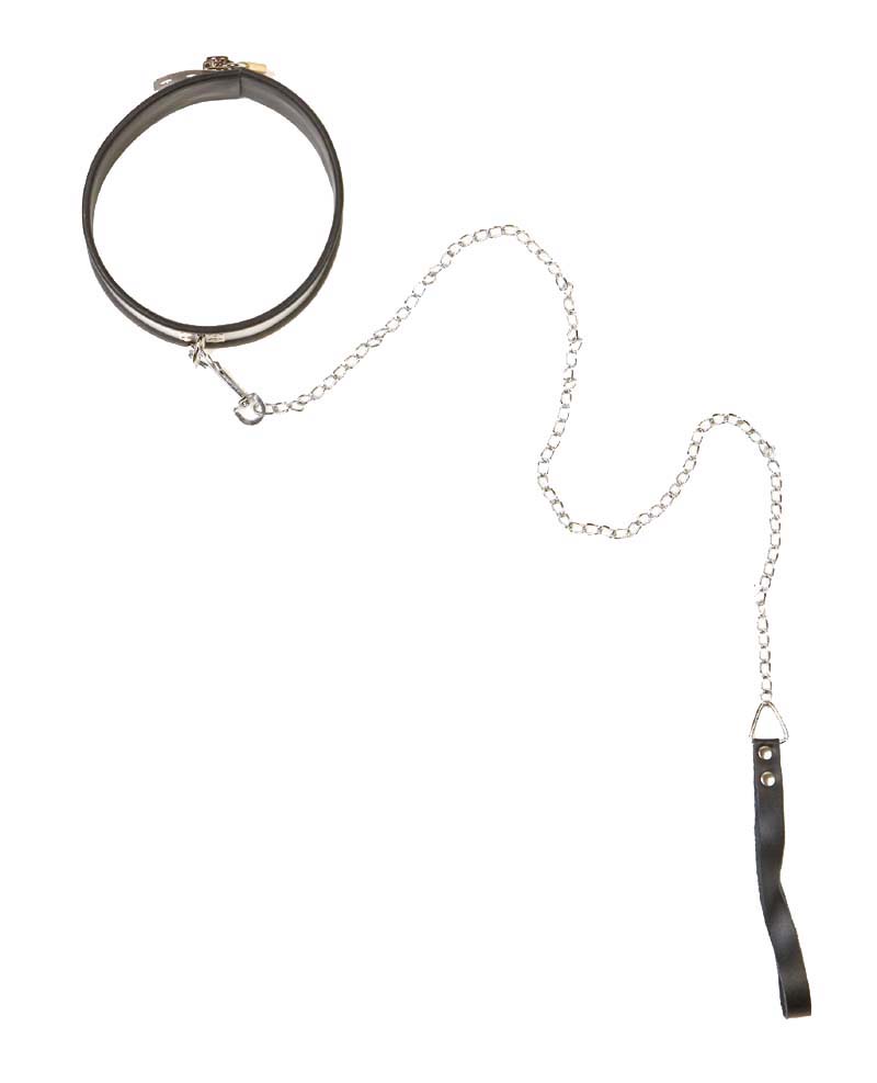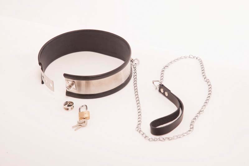 Stainless steel banded collar with a soft rubber inside and edge. Adjustable sizes from 11 to 16 inch circumference. Comes with a removable chain leash with a leather strap at one end and an attaching clip at the other. Secures closed with an included padlock.