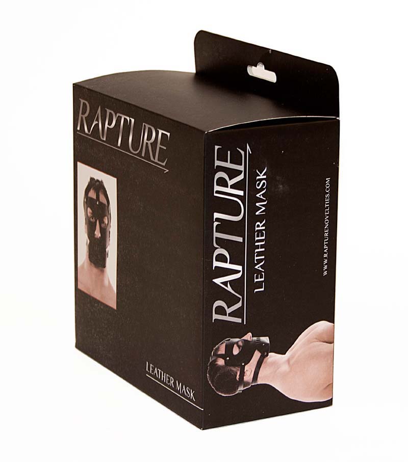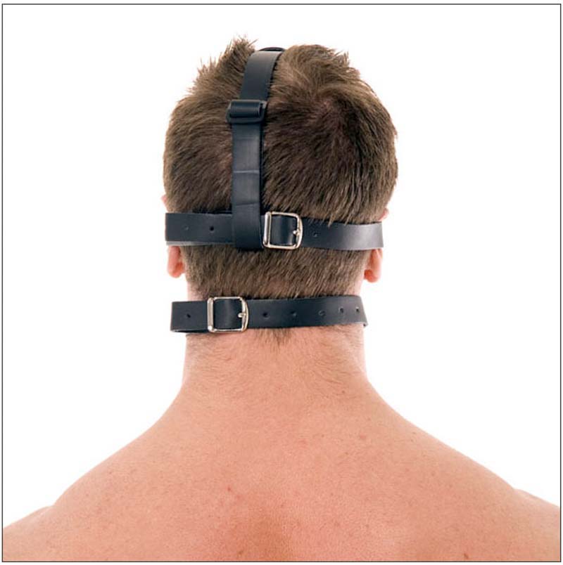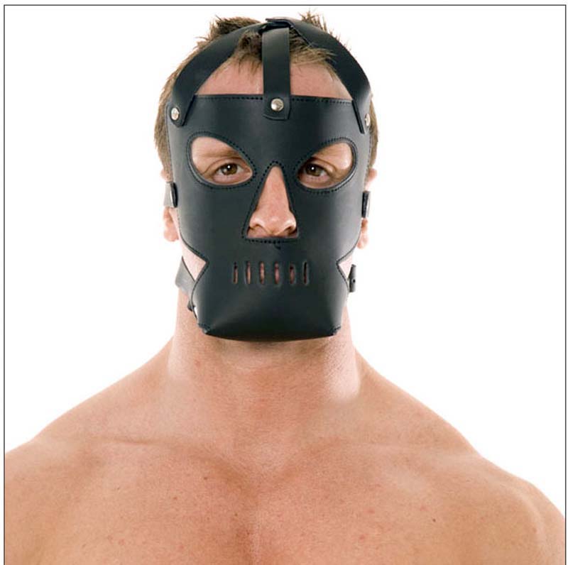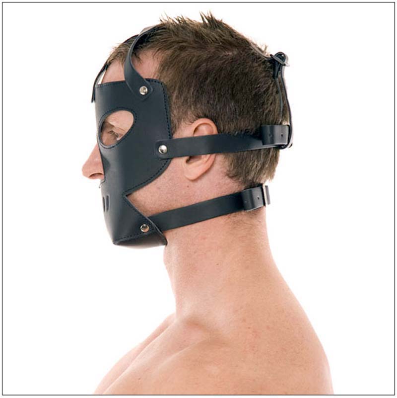 This leather mask features eye, nose and mouth cutouts. The mask fits under the chin for a snug fit and unique appearance. It has 2 adjustable buckle straps that fit over the head and around the head. There is an adjustable chin pocket strap that buckles the chin cup and fits around the neck. This mask is made of pliable leather with stitched edging and adorned with silver rivets. 2''