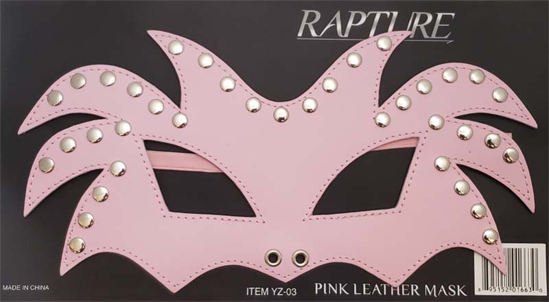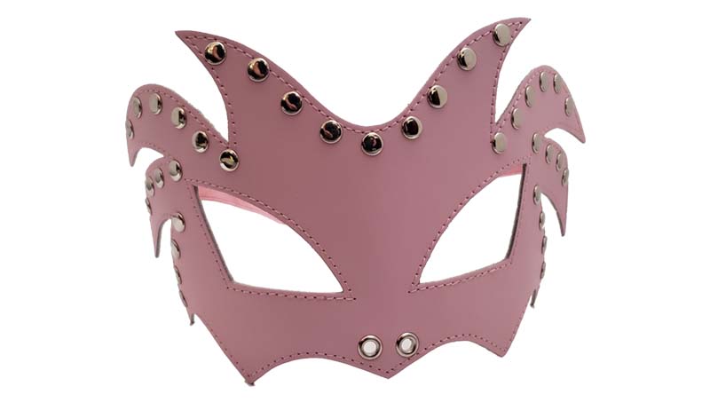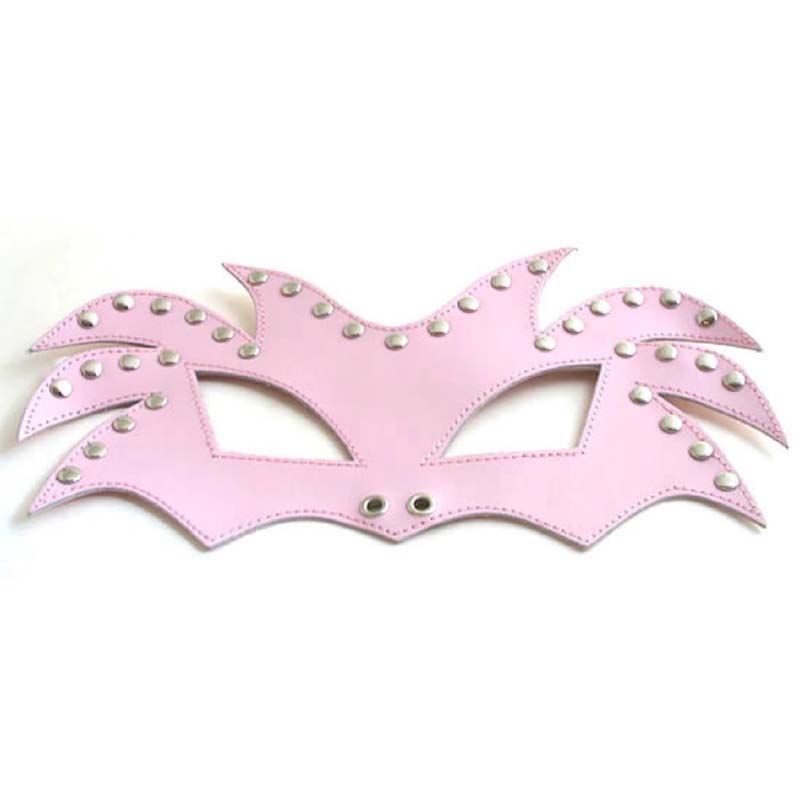 Pink all leather mask accented with silver rivets around the edges. An elastic bank fits around the head to secure the mask to the face.